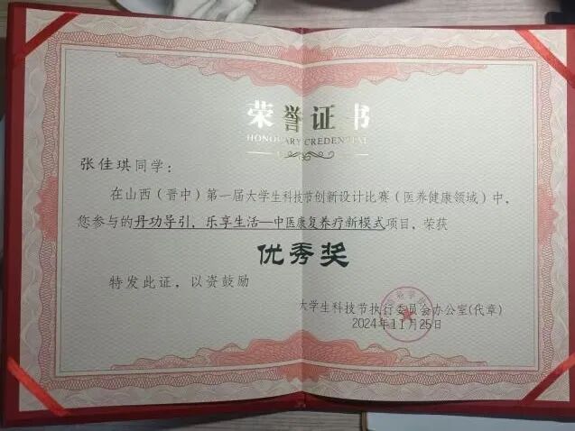 目前,已有三届学生转段到研究生阶段,转段率100%;2018级学生已于2024年首次参加医师资格考试,考试通过率91.53%。学院学生2023年获第八届全国学生“学宪法,讲宪法”活动“新华书店杯”山西赛区总决赛素养竞赛优秀奖、“外研社·国才杯”“理解当代中国”全国大学生外语能力大赛山西赛区(英语组)山西赛区决赛阅读赛金奖、演讲赛银奖;“外研社·国才杯”“理解当代中国”全国大学生外语能力大赛国赛阅读赛铜奖;2024年获首届晋中大学城高校学生创业活动获现代农业类组别创新奖(二等奖)、第九届全国学生“学宪法 讲宪法”活动“新华书店杯”山西赛区总决赛演讲比赛三等奖和素养竞赛三等奖、山西省科技活动周•山西(晋中)第一届大学生科技节创新设计比赛医养健康领域优秀奖、华北五省(市、自治区)大学生人文知识竞赛山西赛区决赛团队赛三等奖、“外研社·国才杯”“理解当代中国”全国大学生外语能力大赛英语组山西赛区决赛演讲赛铜奖;2025年获第十届全国悦读中医活动阅读推广人称号、“建行杯”中国国际大学生创新大赛山西赛区决赛金奖2项、“络学”杯中医药知识竞赛全国赛二等奖。